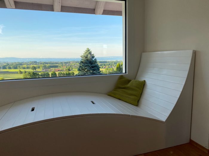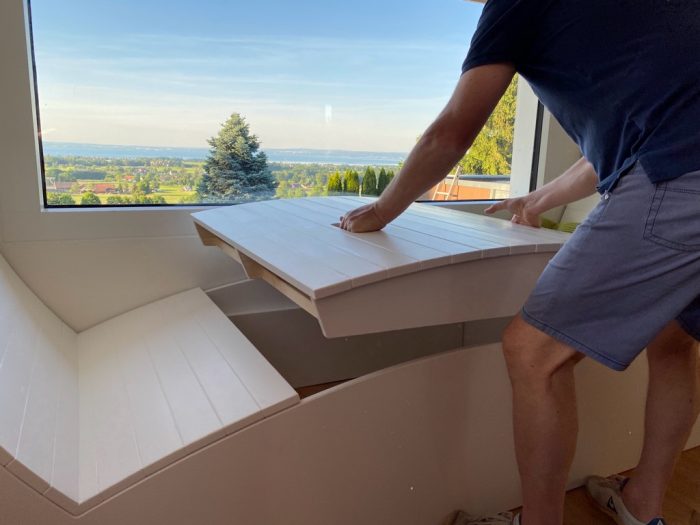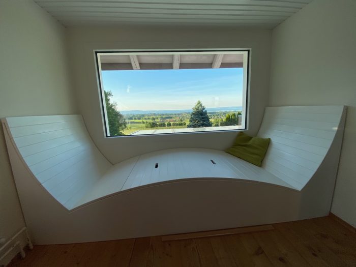 Bank am Fenster. Wohnhaus Lömmenschwil. Atelier GRAFIDEE.